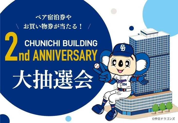 中日大樓承蒙各位厚愛,即將迎來2週年。為此,我們將舉辦「2週年慶典」,以感謝各位平日的支持。本次慶典中,代表取締役社長臼田信行將向各位致詞。此外,中日龍隊的官方吉祥物「ドアラ」(Doala)將作為特別來賓登場。