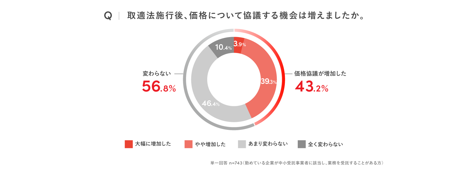 When subcontractors were asked if price negotiations had increased after the Act's enforcement, 43.2% responded "increased," while 56.8% responded "no change," accounting for about 60%. This indicates that while price negotiations are beginning to be promoted, many personnel have not yet felt a change.