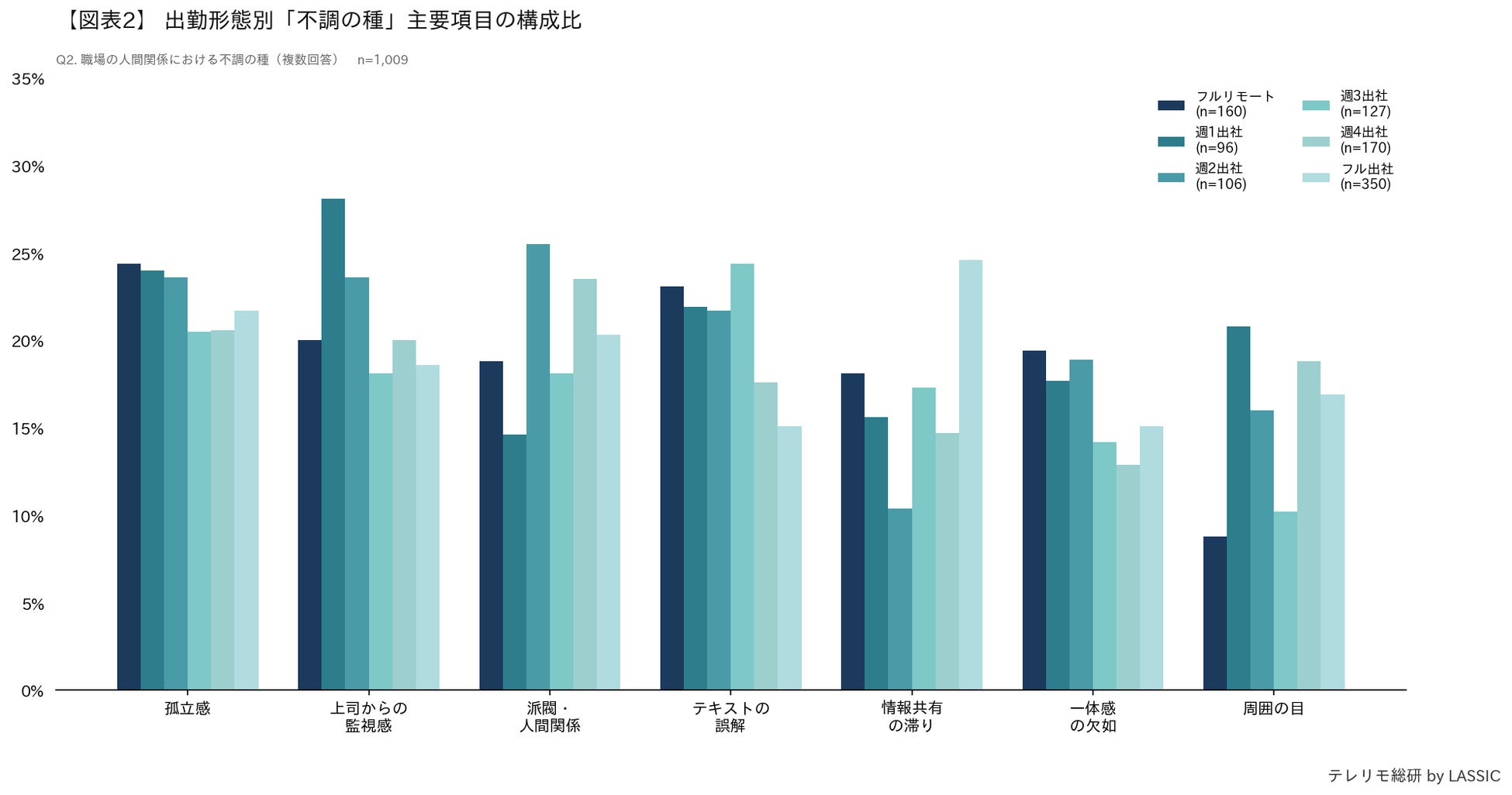 このように、不調の種として高い構成比を示す項目は出勤形態によって異なっている。フル出社層では「情報共有の滞り」、週1出社層では「上司からの監視感」「周囲の目」、週2出社層では「派閥・人間関係」がそれぞれ特徴的に高い値を示していることが確認できる。