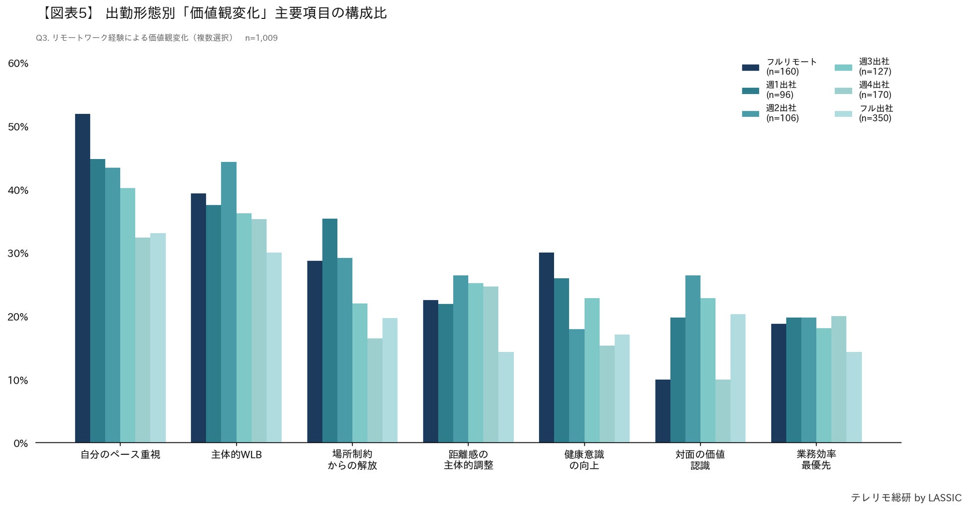 • フルリモート層1位の「自分のペース重視」は51.9%と他の勤務形態と比較して突出